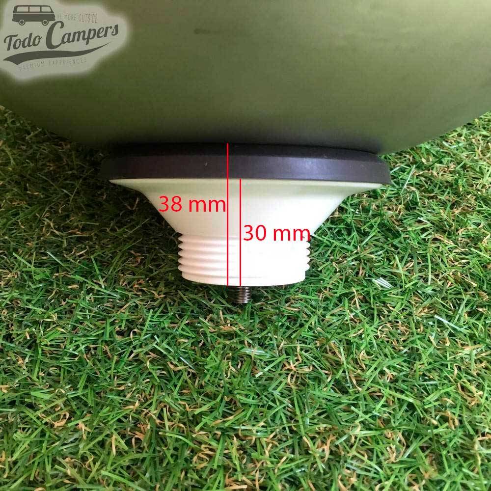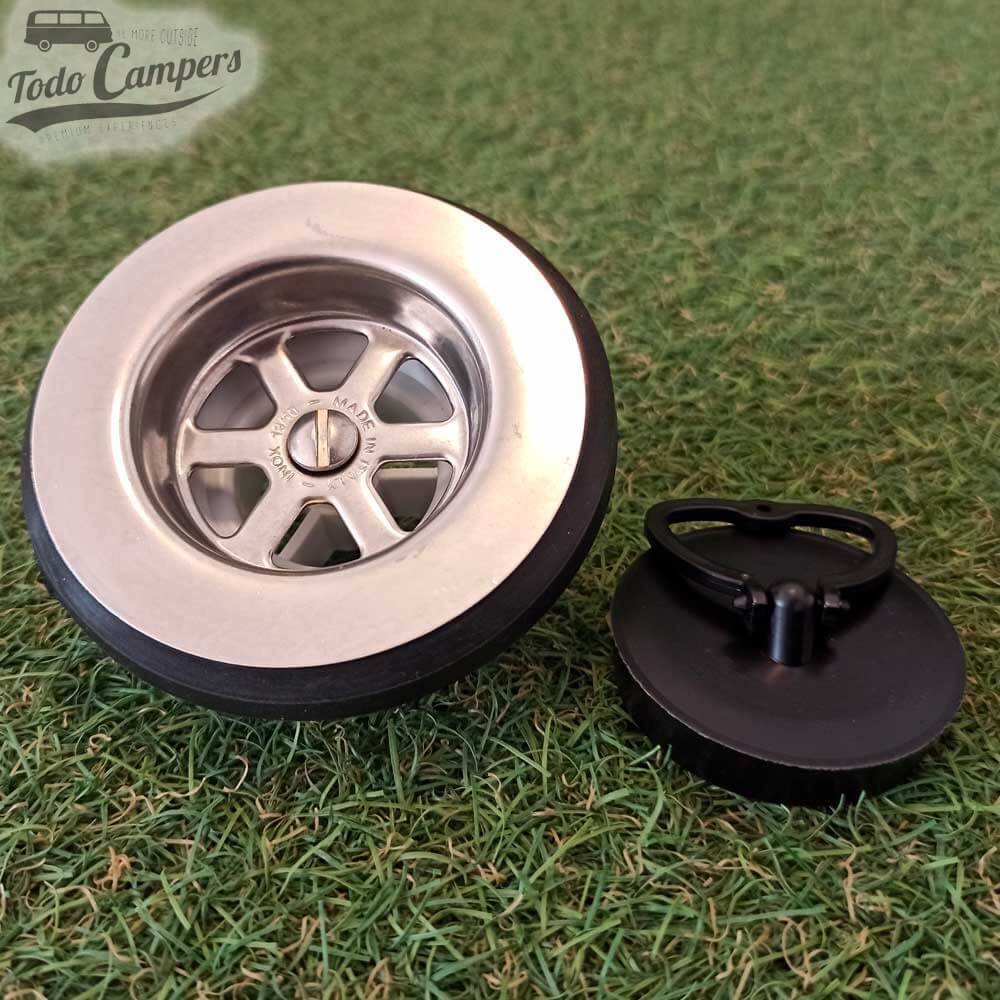 desagüe con tapón instalado en plato de ducha camper