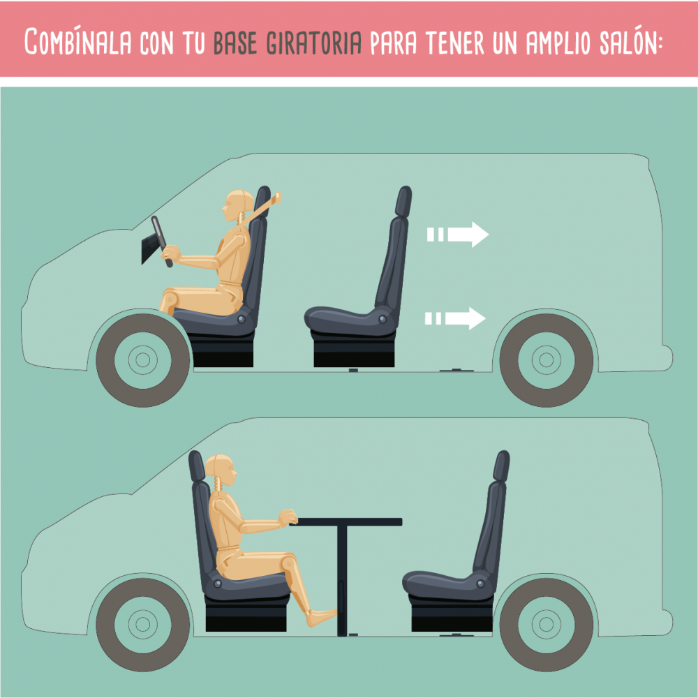 Si viajáis en pareja, este accesorio es perfecto para vosotros. En conducción iréis sentados en la primera fila (la del volante) y como la fila trasera no se estárá usando por pasajeros, podéis dejar el asiento retrasado y tener un salón permanente.