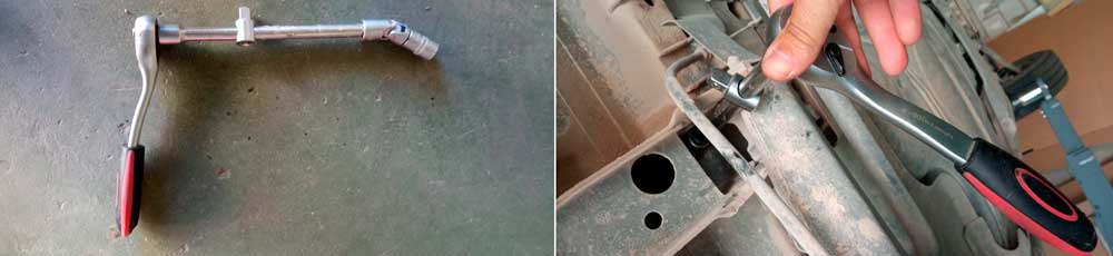 Si tu furgoneta es de batalla corta con tercera fila de asientos, será necesario desmontar los enganches de dicha fila. Éstos están sujetos por debajo del chasis del vehículo por lo que será necesario acceder a ellos a través de una llave trócola: