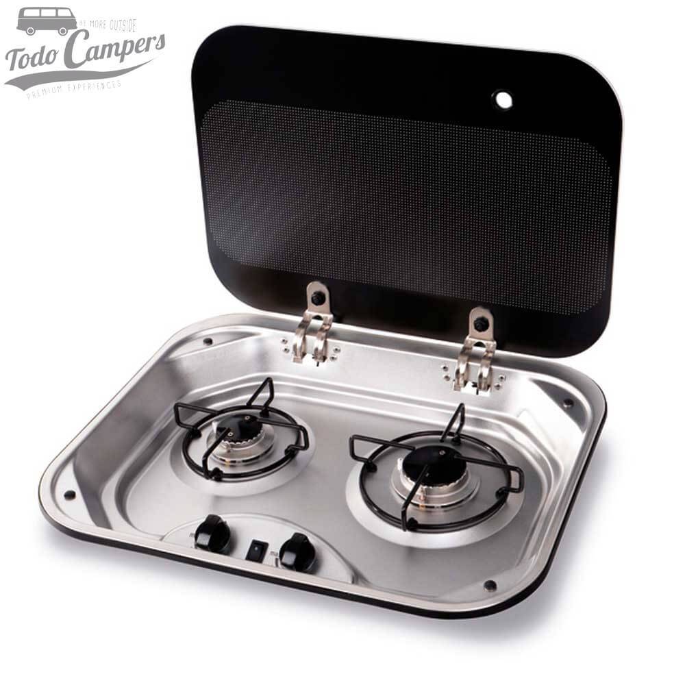 Si estás camperizando tu furgoneta te encantará esta cocina de gas de dos fuegos. Sólo mide 47 x 37 cm. En ella podrás usar todo tipo de sartenes y cacerolas.