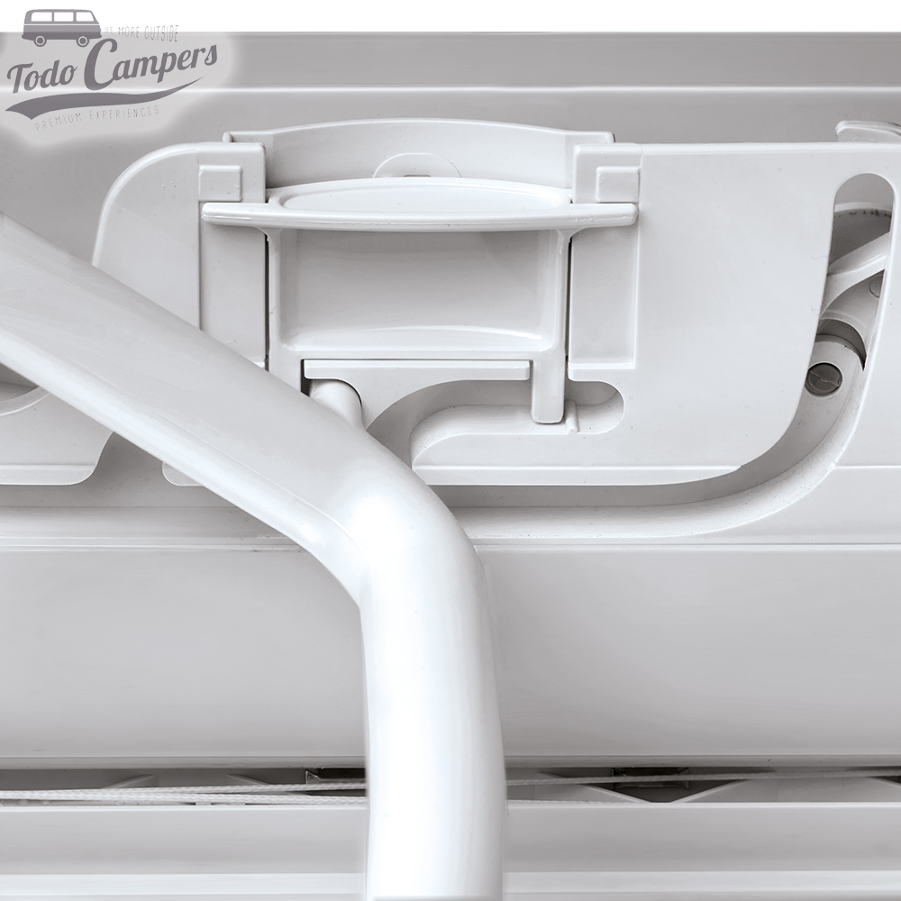 Esta claraboya Dometic Heki no incluye sistema de ventilación integrado, pero sus medidas son compatibles con el Turbo Kit de Fiamma. Este accesorio acóplase a la claraboya con unos enganches específicos y cumple la función de ventilador y extractor de humos.