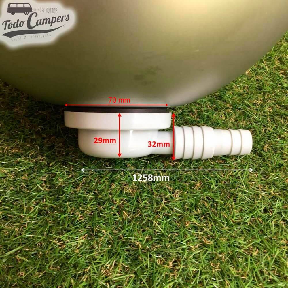 Desagüe acodado 90º con salida para mangueras de diámetro Ø 19 o 25 mm.