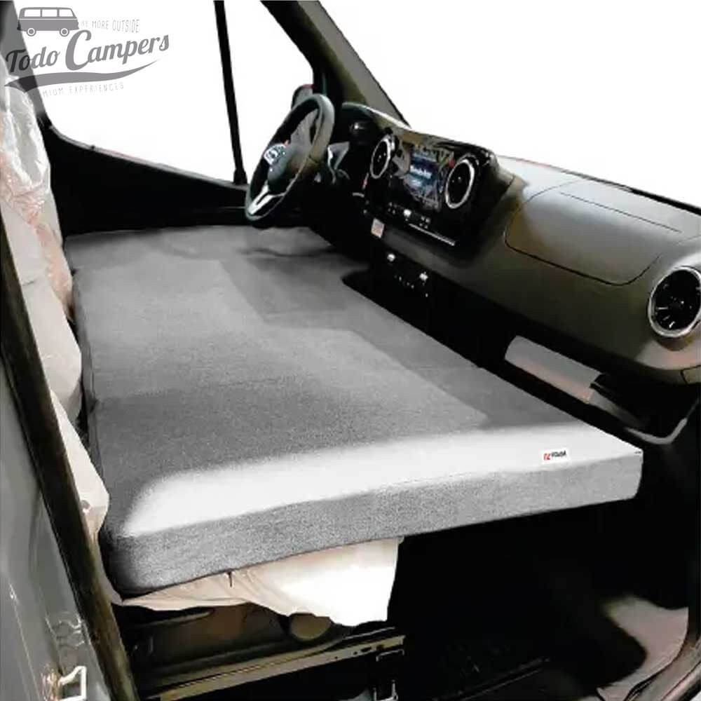 Esta cama plegable de cabina se coloca desplegada en la primera fila de asientos de tu furgoneta Mercedes Sprinter (chasis W907). Dadas sus dimensiones, es ideal para que duerman en ella niños o mascotas, pero un adulto de estatura y peso medio también podría usarla sin problemas. Es compatible tanto con dos asientos individuales como un asiento individual más banqueta doble.