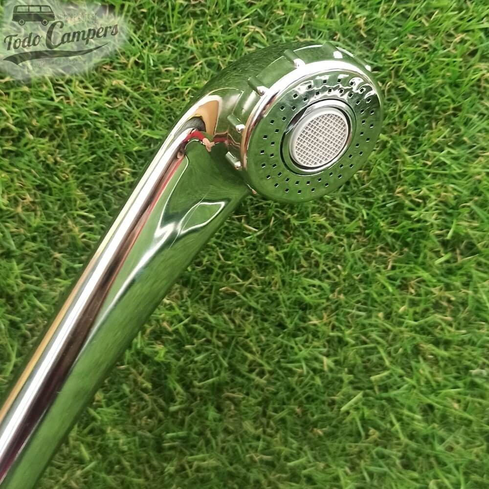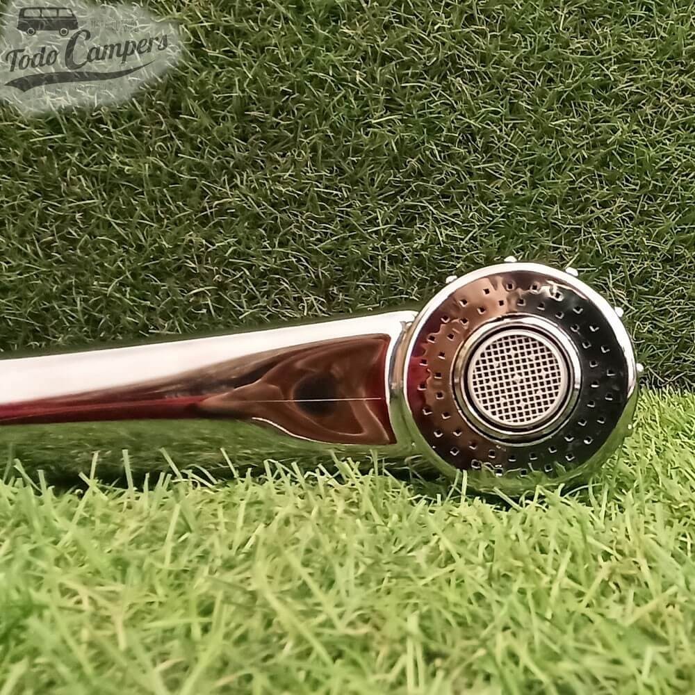 • Alcachofa de ducha es modelo London en cromo. Este cabezal es muy popular porque combina dos tipos distintos de salida de agua. Encontrarás un aro exterior que dispersa más el caño de agua y un chorro central con aireador y filtro extraíble (incluye llave de plástico para poder abrirlo y limpiarlo con facilidad). Mide 195 mm y el cabezal tiene un diámetro de 50 mm.