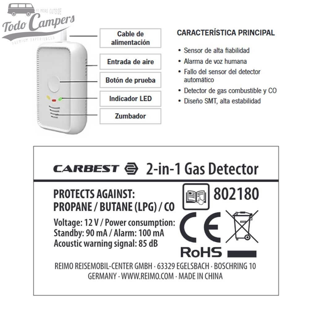 Detector de gas Dual de la marca Carbest válido tanto para gases GLP (Butano y Propano) como para monóxido de carbono (CO). Funciona a 12 V por lo que es perfecto para instalarse en furgonetas camper, autocaravanas y caravanas.