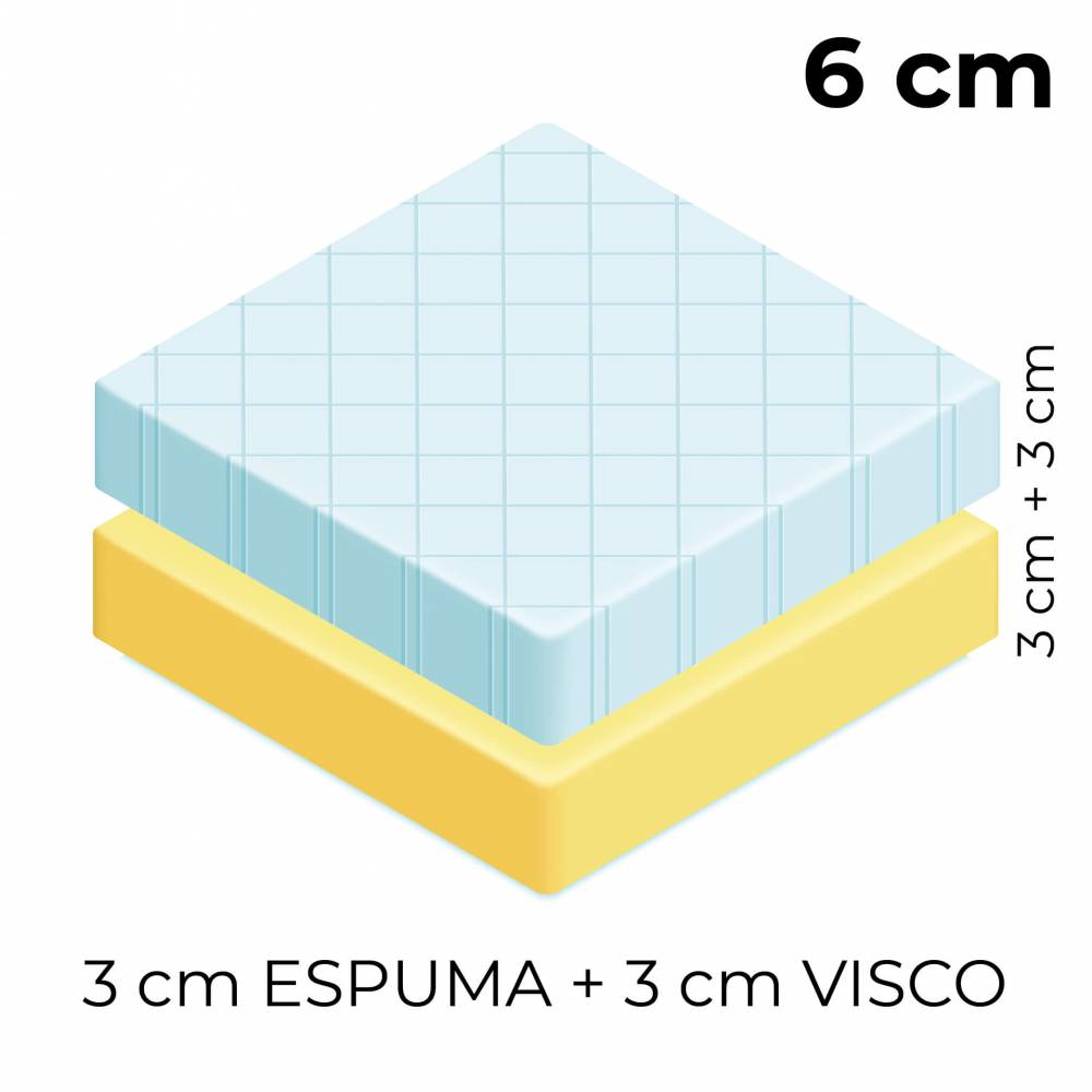 - Colchón de Espuma HR en 3 cm de grosor y densidad 28 kg/m3 (Firmeza Extra) + 3 cm de Viscoelástica en la parte superior