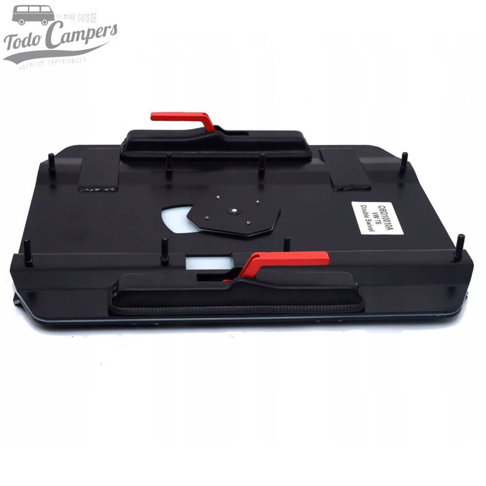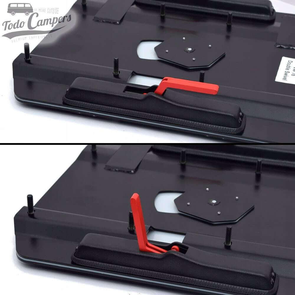 Si tienes un asiento doble en tu Volkswagen T5, T6 o T6.1 estás de suerte. Te ofrecemos la solución perfecta: una base giratoria para convertir tu asiento de copiloto en un asiento de salón comedor. Gana espacio y confort al poder girar la bancada hacia el interior de tu habitáculo. Podrás ganar más espacio si lo combinas con la estructura de asientos ST1000, ya que podrás retrasar la segunda fila de asientos y conseguir una superficie aún mayor.