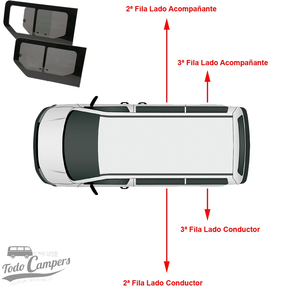 Nota: En Todo Campers llamamos 1ª fila a la del conductor, 2ª fila a la intermedia y 3ª fila a la trasera. Ver esquema.