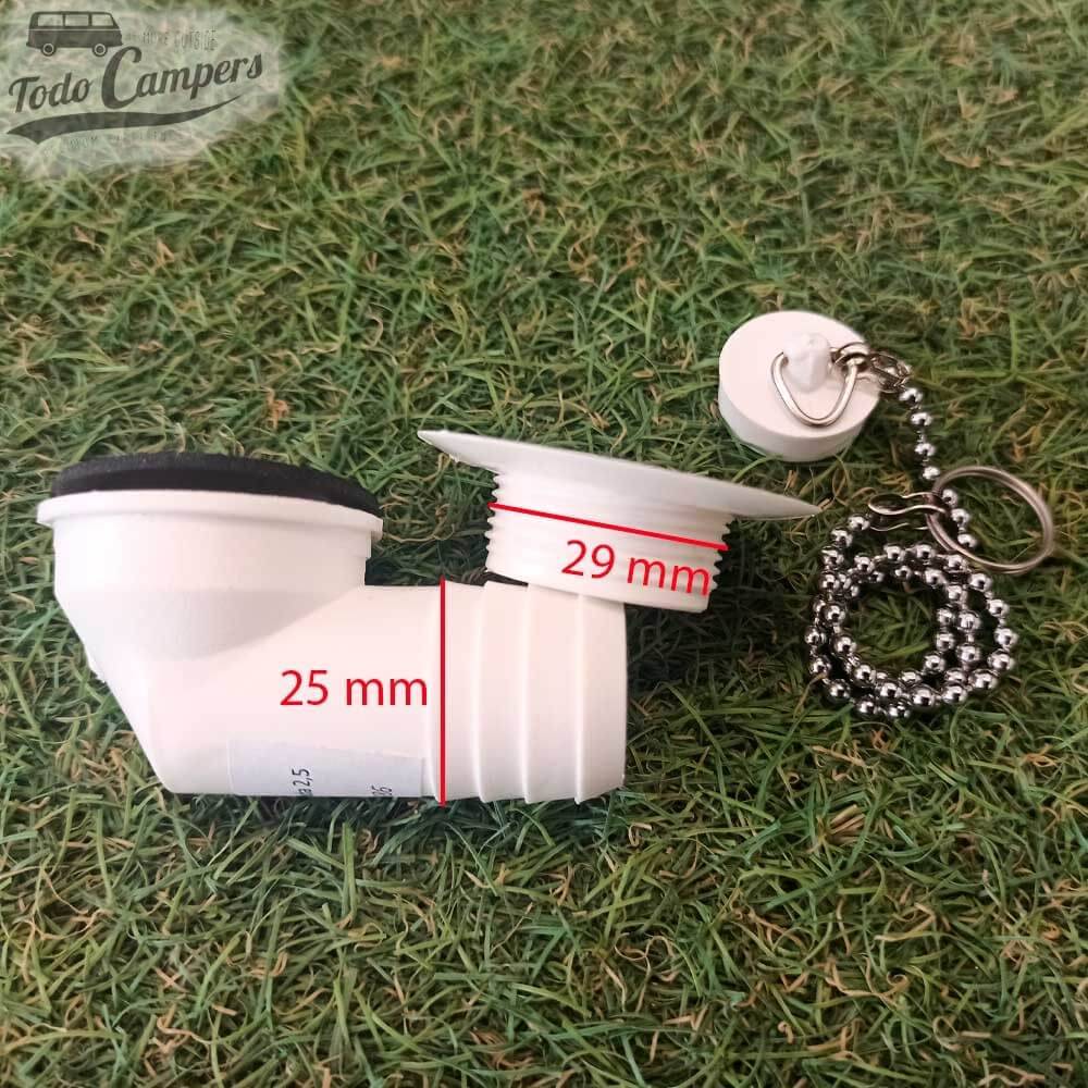Desagüe en codo - Salida 25 mm, Tipo B - con tapón de agua a un lado y cadena