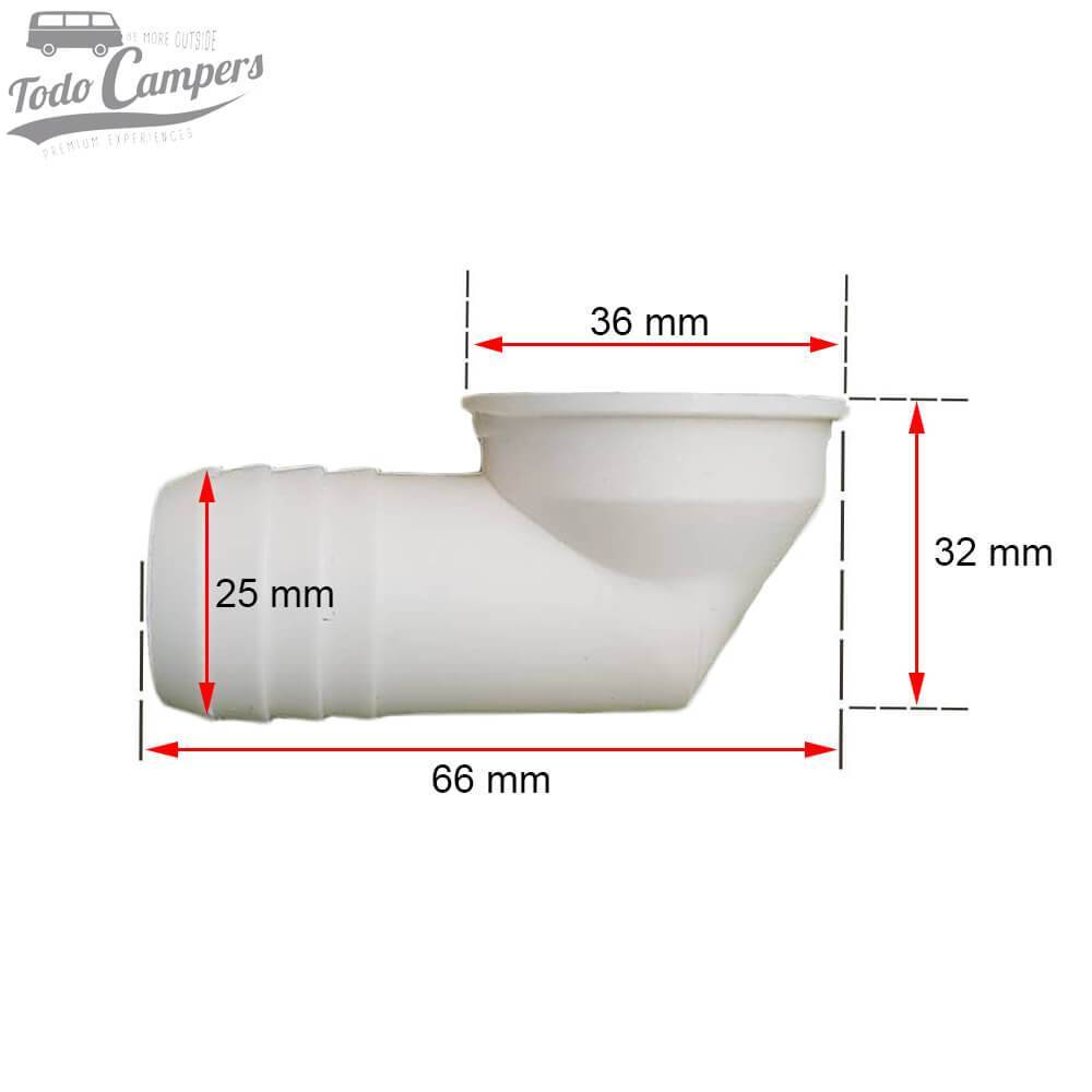 Desagüe de plástico acodado en 90º con salida para mangueras de diámetro Ø 25 mm.