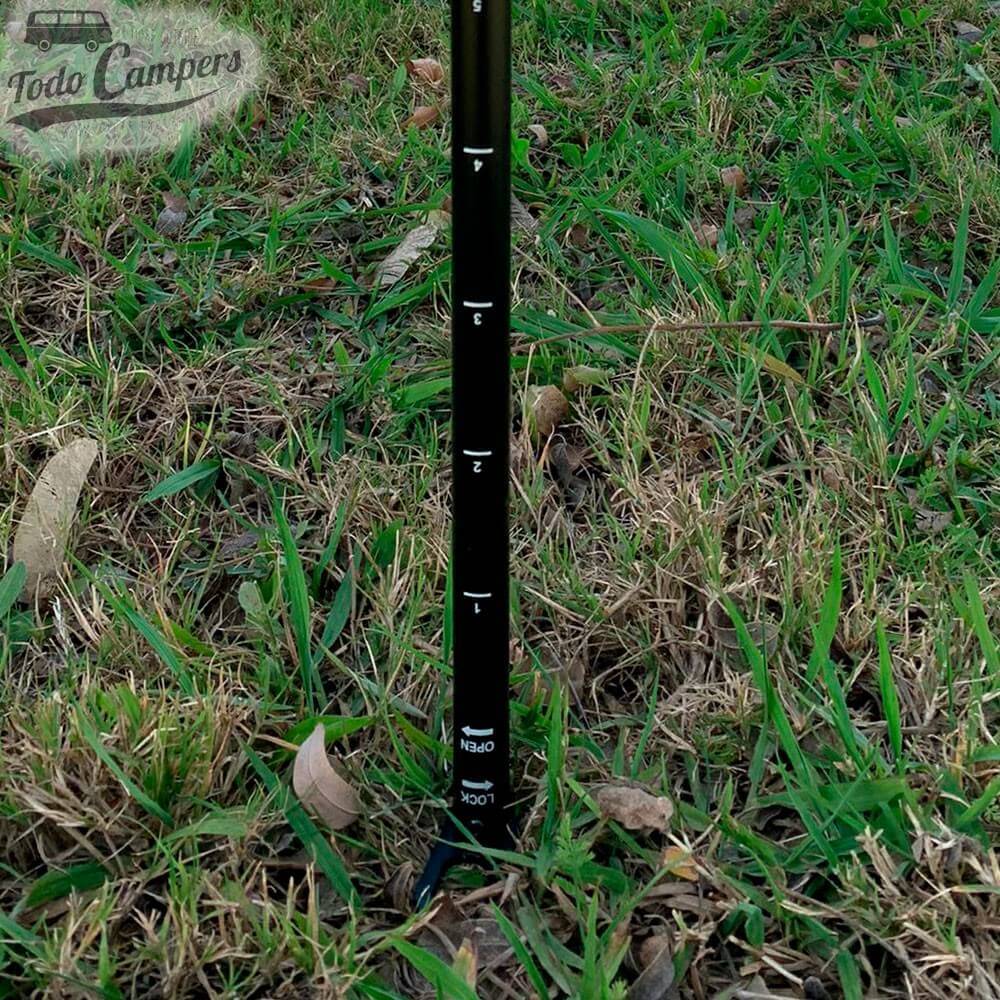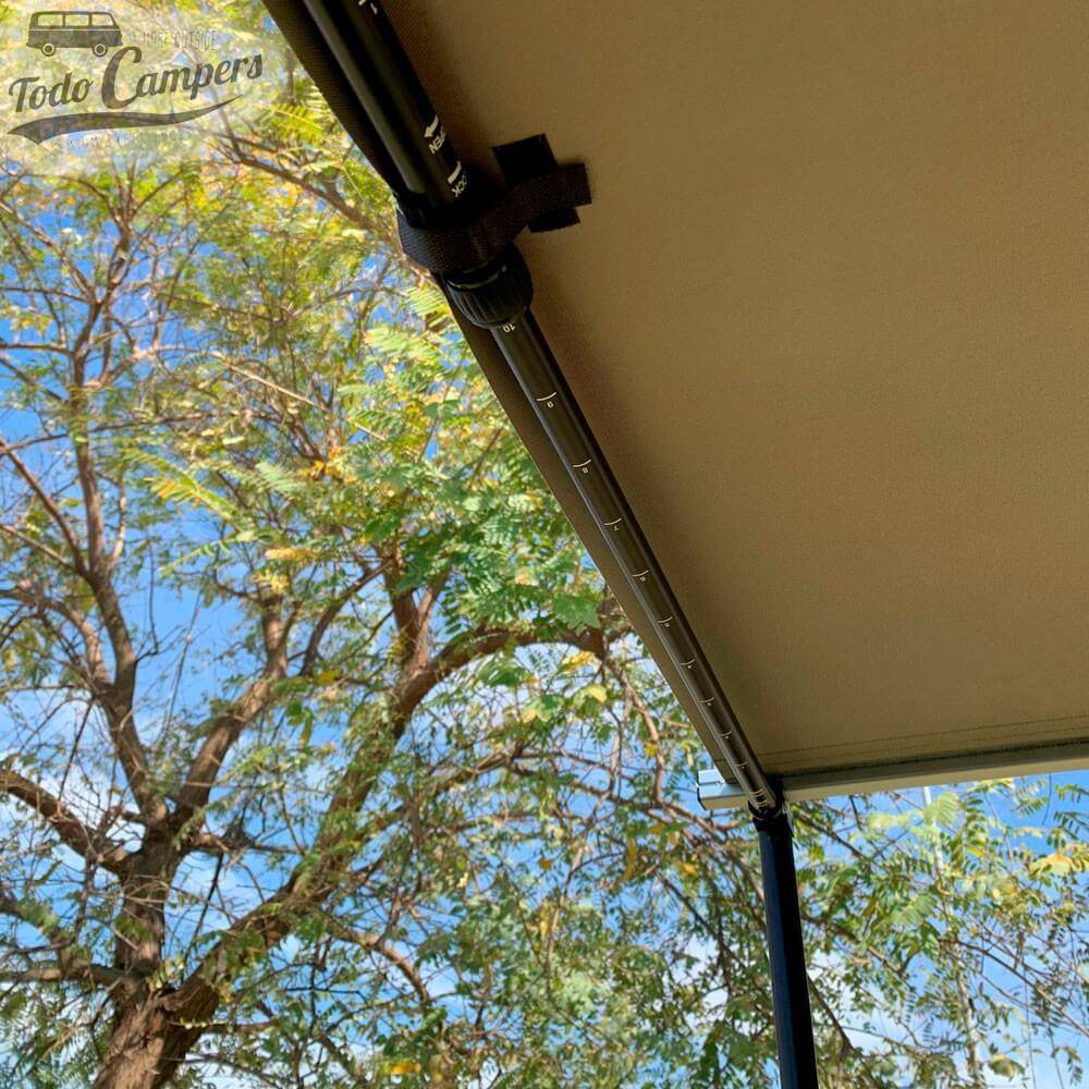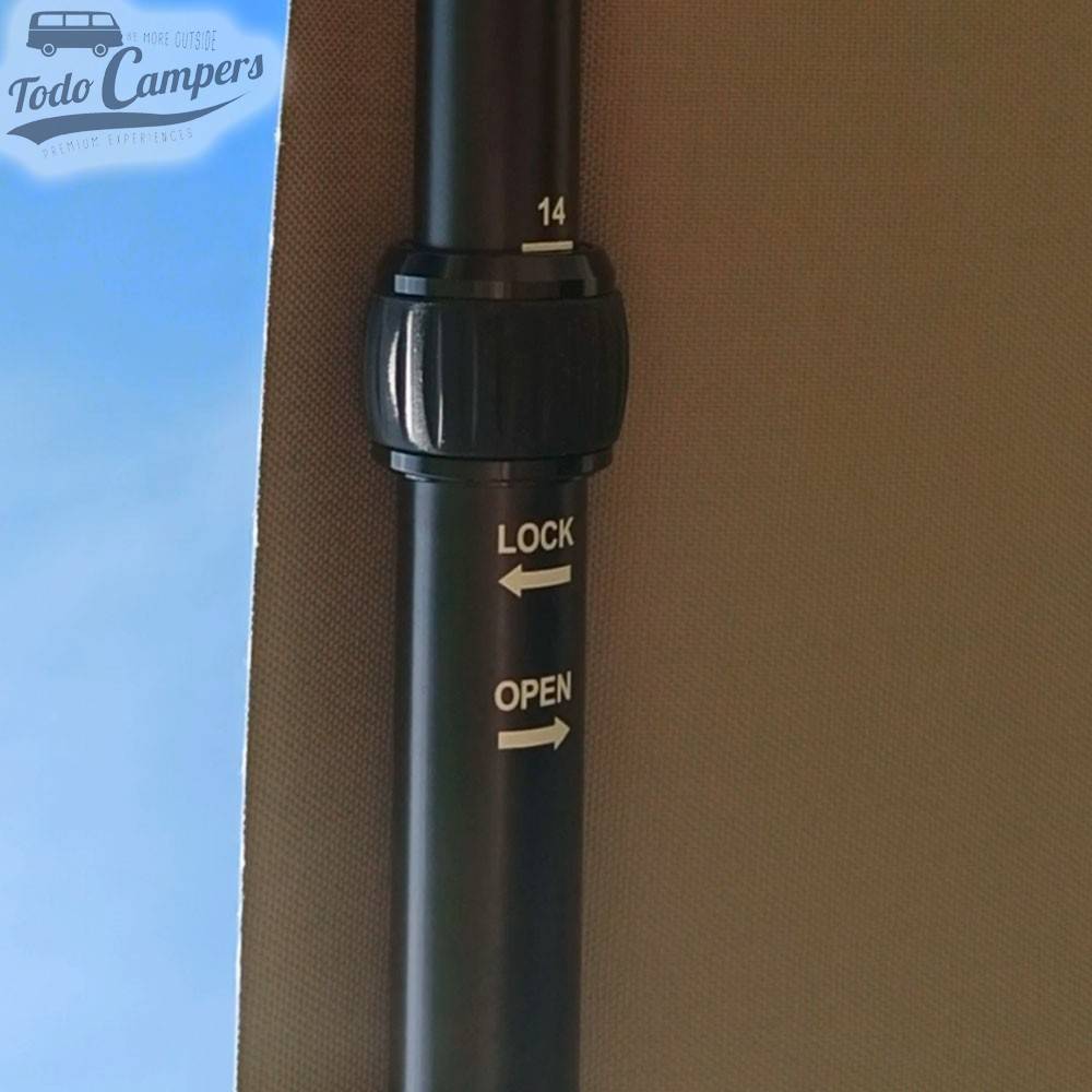 El armazón del toldo está realizado en aluminio de color negro ultra ligero. El toldo es de tela beige de alta calidad, muy duradera y resistente al agua. Los mástiles son telescópicos y tienen unas marcas numeradas para que sea más cómoda su extensión ya que podremos abrir y alinear ambos lados por igual.