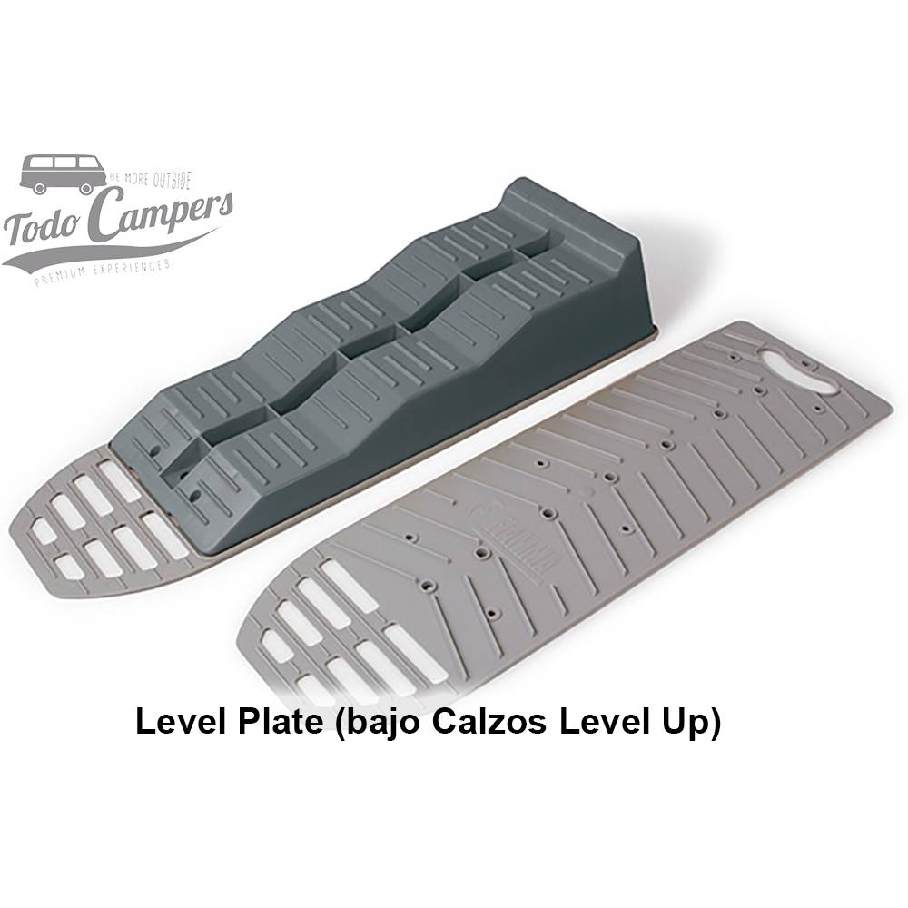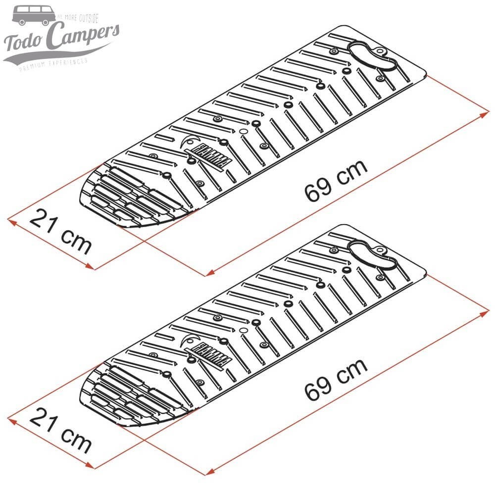 Conjunto de 2 placas antiderrapantes desenhadas para uma fácil instalação sobre os Calzos Level Up de Fiamma. Evitam derrapagens sobre superfícies lisas, bem como que os niveladores se fundam em terrenos arenosos e barracentos.