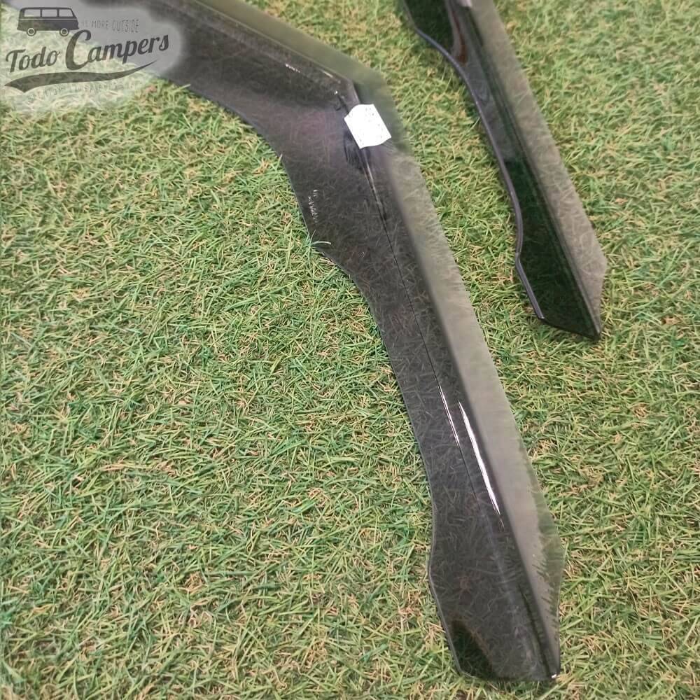Os nossos defletores oferecem uma proteção ideal contra correntes de ar e chuva. Permitem que se abram ligeiramente as janelas dianteiras a qualquer momento e se produza um agradável e constante intercâmbio de ar no interior do veículo. Sobretudo com tempo chuvoso, manter as janelas ligeiramente abertas evita o perigo de que os vidros se embaciem.
