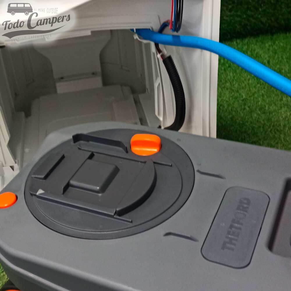 - Cassette: É um tanque removível que recolhe os resíduos. Encontra-se debaixo da sanita e pode aceder-se a ele a partir do exterior do veículo através de uma porta de serviço. Neste depósito é onde se verte o líquido azul ou pastilhas que dissolvem os sólidos para eliminá-los mais facilmente.