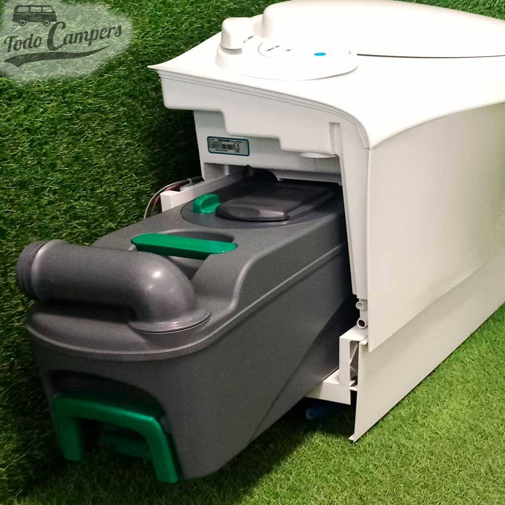 Este WC es uno de los más cómodos del mercado. Cuenta con un sistema eléctrico silencioso de descarga de la cisterna. Olvídate de tener que bombear la cisterna manualmente, tan solo necesitarás apretar el botón de vaciado. Se conecta al depósito central de agua de tu furgoneta para abastecer la cisterna.