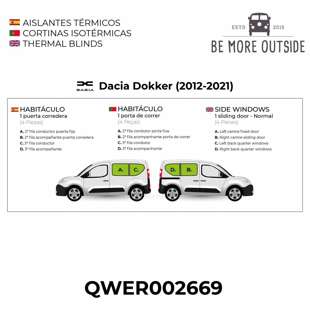 Estes protetores térmicos são válidos para as Dacia Dokker de todos os modelos e anos. No entanto, devemos ter em conta alguns fatores diferenciadores:
