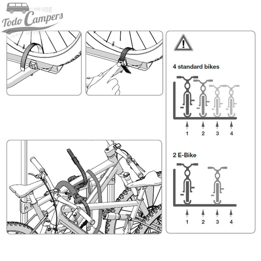 - NOTA: No caso de combinar bicicletas tipo E-Bike com tipo standard, a 4ª calha deve ficar sempre livre. NÃO é válido para transportar 2 e-bikes junto a 1 ou 2 standard (máximo 1 e-bike junto a máximo 2 bicicletas standard).