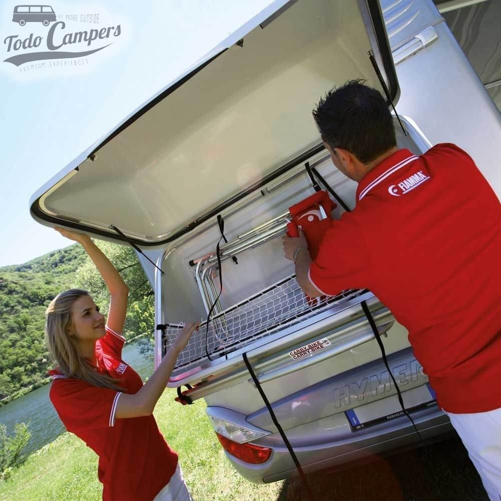 Porta-bicicletas Carry Bike para qualquer tipo de autocaravanas. Esta nova versão de 2023 é um Restyling do modelo anterior, uma das novidades é que permite o transporte de bicicletas tipo E-Bikes.