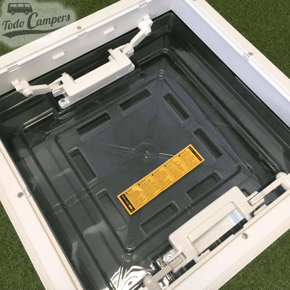 Esta claraboia Dometic Heki não inclui sistema de ventilação integrado, mas as suas medidas são compatíveis com o Turbo Kit da Fiamma. Este acessório prende-se à claraboia com uns ganchos específicos e cumpre a função de ventoinha e extrator de fumos.