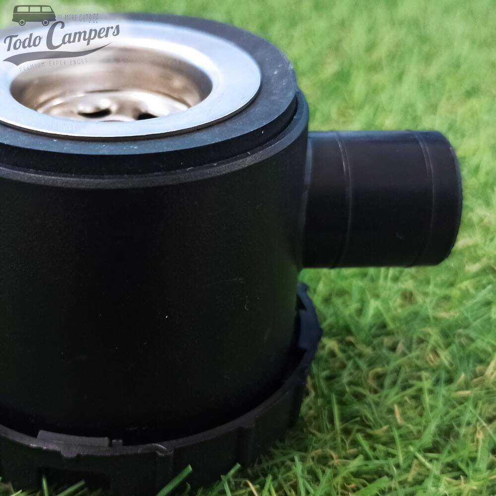Válvula curva de 90º com acabamento metálico ideal para lava-loiças e lavatórios metálicos. Traz um tampão para poder fechar uma das duas saídas. Tem duas saídas para mangueiras de diâmetro Ø 25 mm e sifão para evitar maus odores.