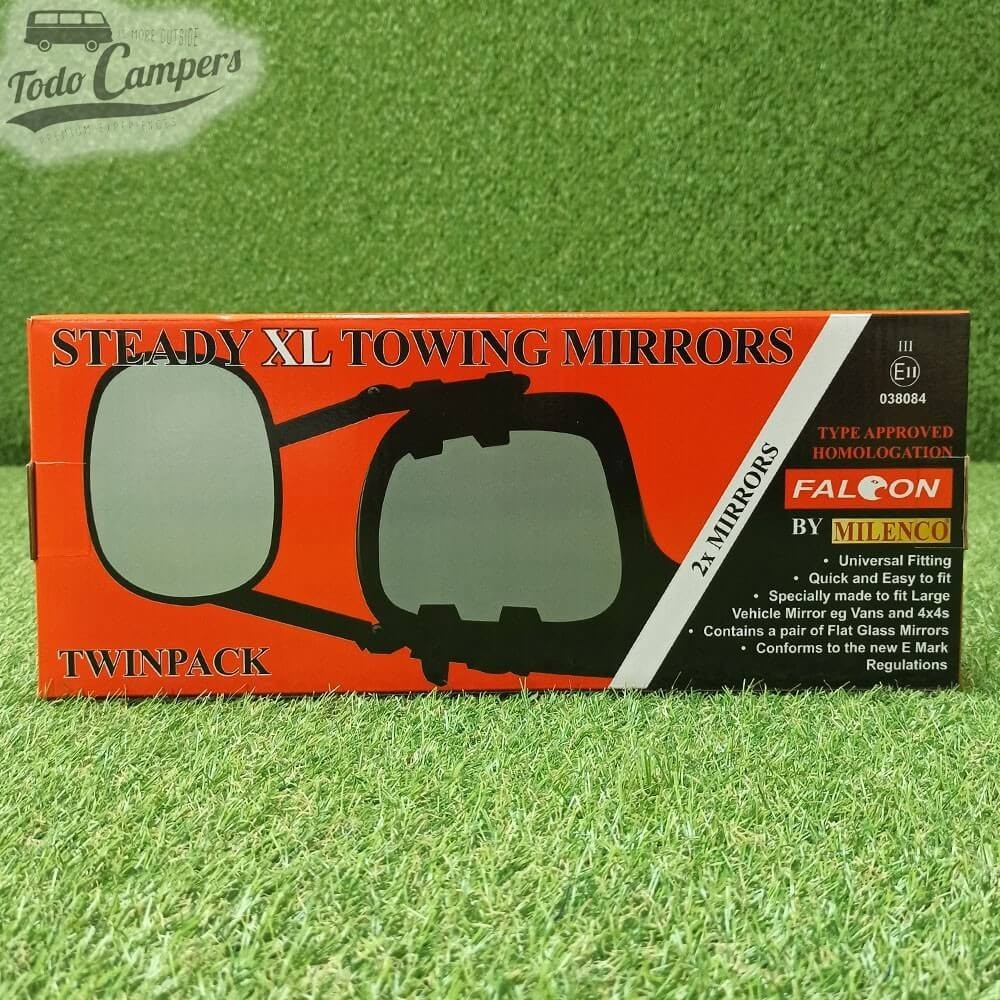 Este Twin pack MGI Steady XL da Milenco vem com dois espelhos planos extragrandes para serem colocados sobre os do seu veículo. São muito fáceis de instalar, basta acoplá-los e apertar as cintas que eles trazem.