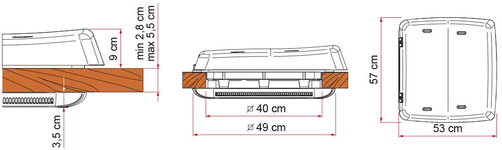 • Medida 40 x 40 cm para grossuras de teto de 2,8 a 5,5 cm.