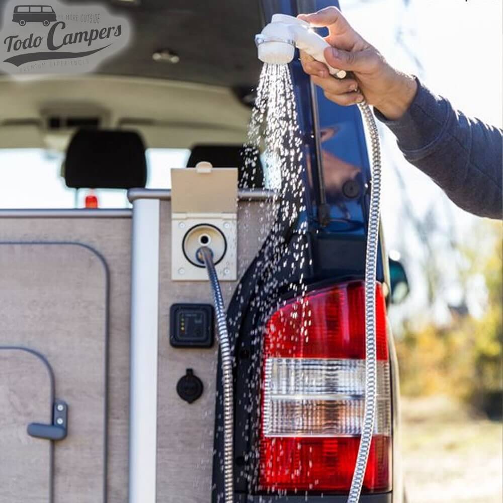 Se é daqueles que gostam de um bom duche ao ar livre, vai adorar esta tomada. Está pensada para se instalar em campervans ou autocaravanas. Deve perfurar a chapa com uma broca de coroa de 60 mm e aparafusá-la. Traz uma junta de borracha vendante para evitar filtrações de água.