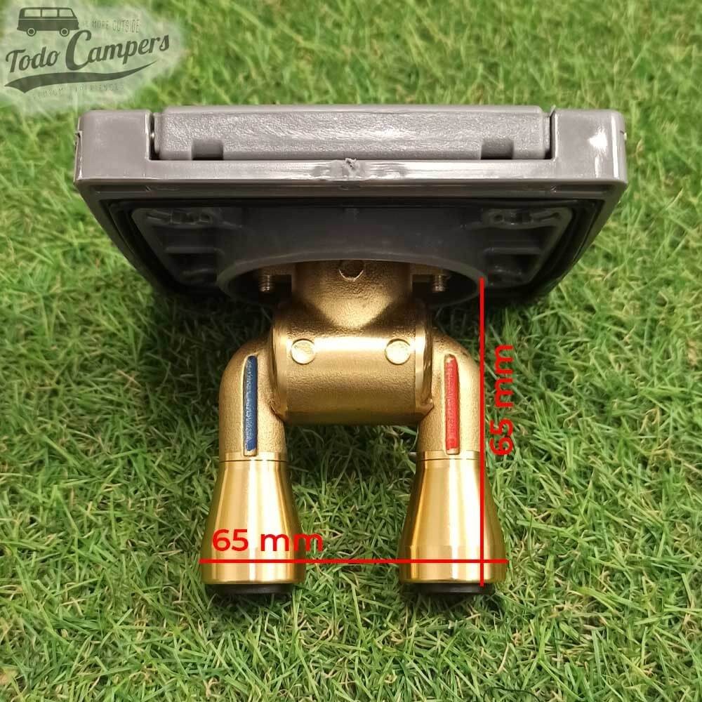 - Na parte INTERIOR: encontrará o sistema de ligação rápida tipo John Guest para tubos rígidos de Ø 12 mm. Existem 2 unidades identificadas por cores para inserir o tubo correto. Se o seu veículo não tiver sistema John Guest, não se preocupe, pode adquirir dois adaptadores (um para cada mangueira de água) para utilizar este duche com mangueiras de 10 mm.