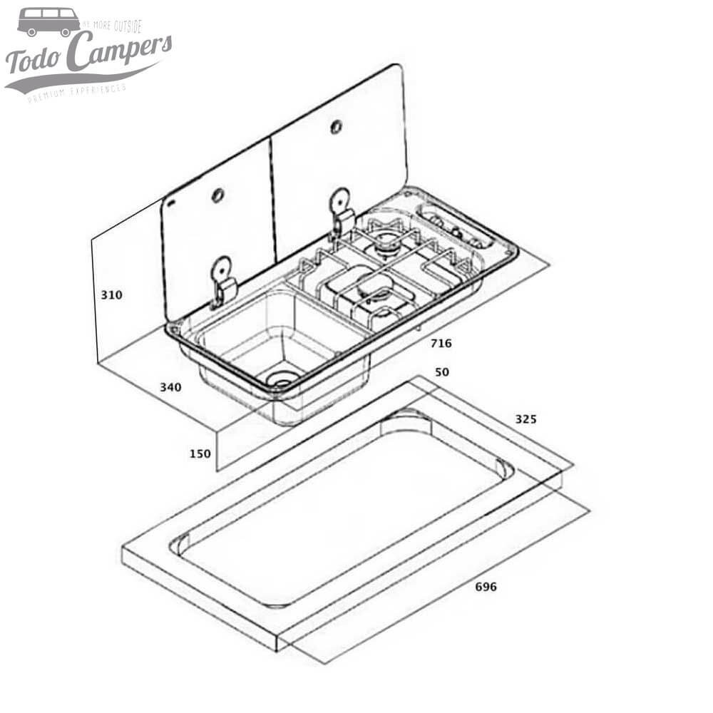 Com este lava-louças + fogão, poderá aproveitar ao máximo o espaço da sua carrinha. Os tampos de vidro de segurança permitem que ao estar fechados possa trabalhar sobre eles ou apoiar objetos. O mais importante numa campervan é ganhar espaço e com este lava-loiças + fogão vai conseguir.