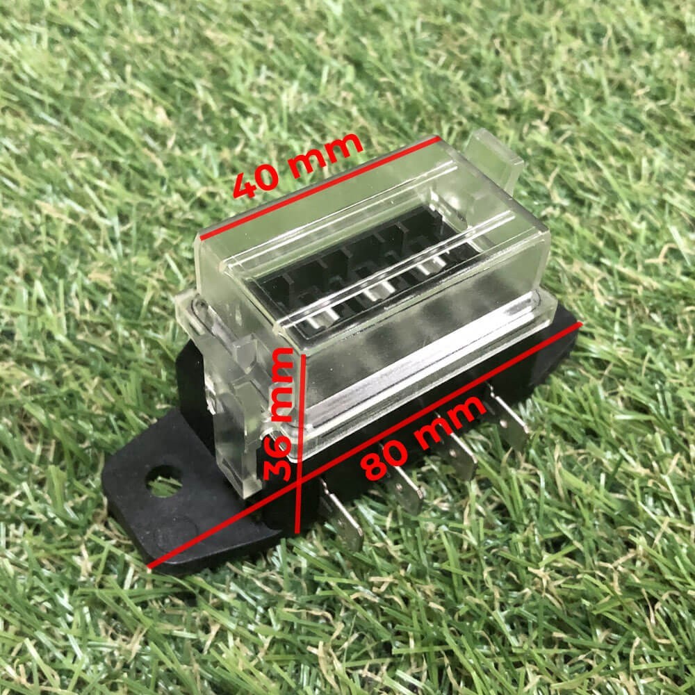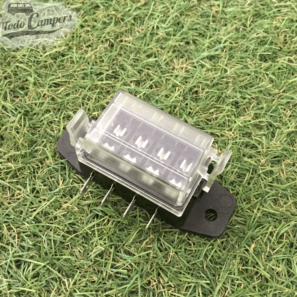 Caixa porta-fusíveis de 4 pins ou ranhuras para 4 fusíveis. Esta caixa está pensada para instalação lateral. Inclui os orifícios necessários para se aparafusar à parede da superfície desejada.