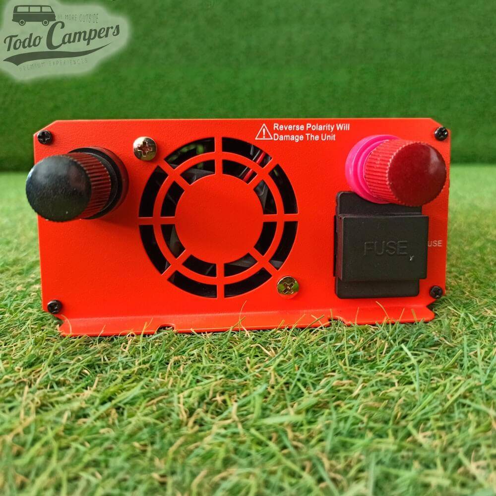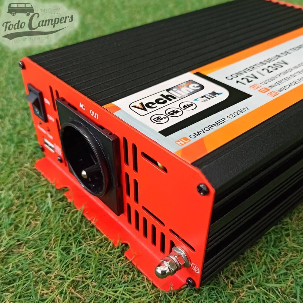 Inversor de corrente Vechline de 1000 W de Onda Retificada. Transforma a corrente de 12 V da bateria a 230 V com um consumo nominal de 1000 W. Proteção de saída contra: curto-circuito, sobrecarga e sobreaquecimento.
