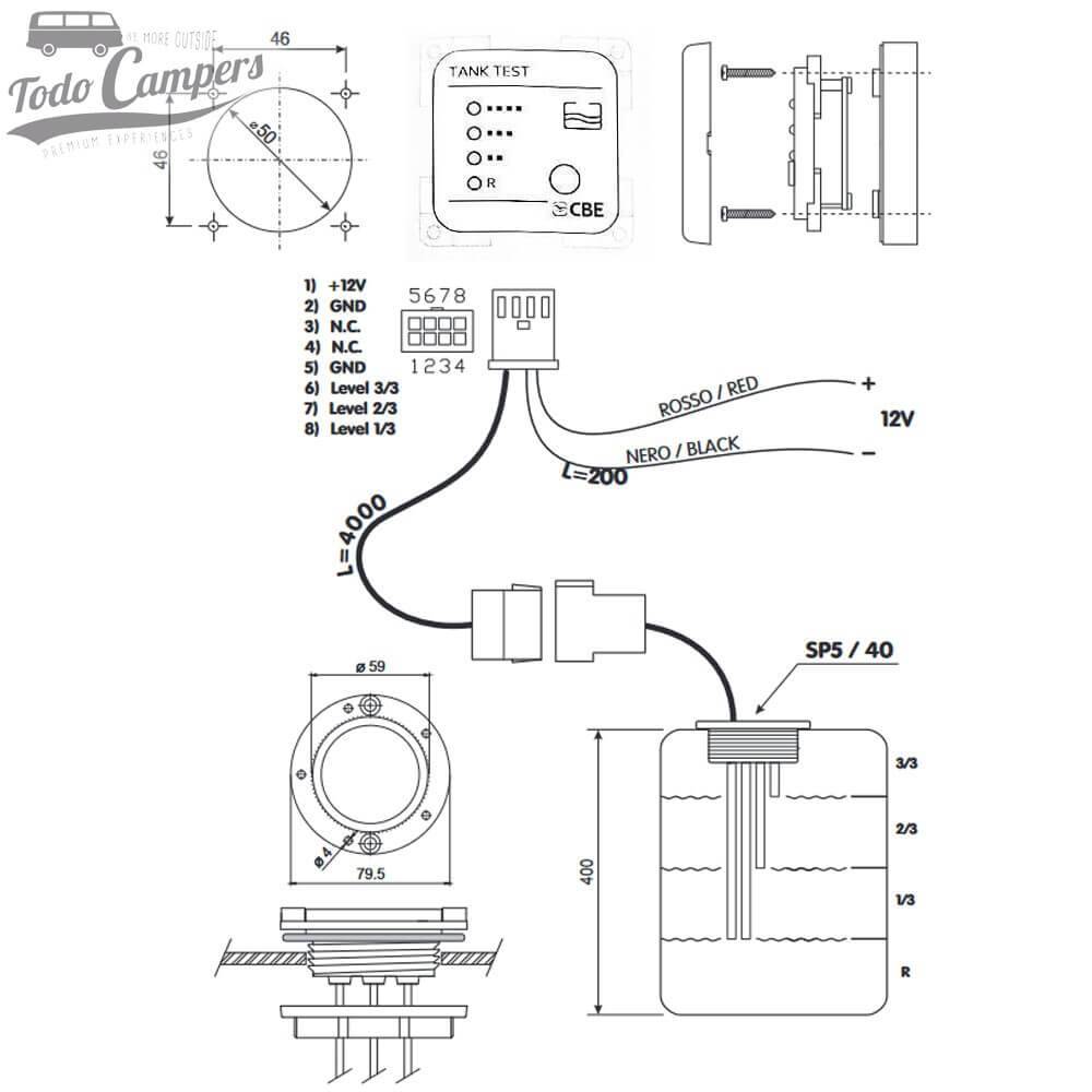 Funciona através de LEDs de cores que se acendem em função do nível de água. Para isso, inclui uma sonda de 26 cm que deverá instalar no depósito e cortar segundo as instruções.